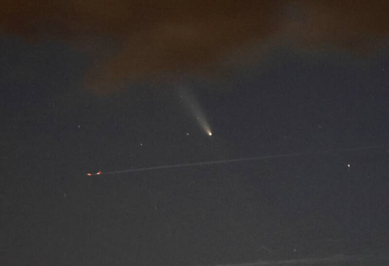 Zoom 109mm, Pose de 2 secondes. Un avion passe juste dessous la comète.