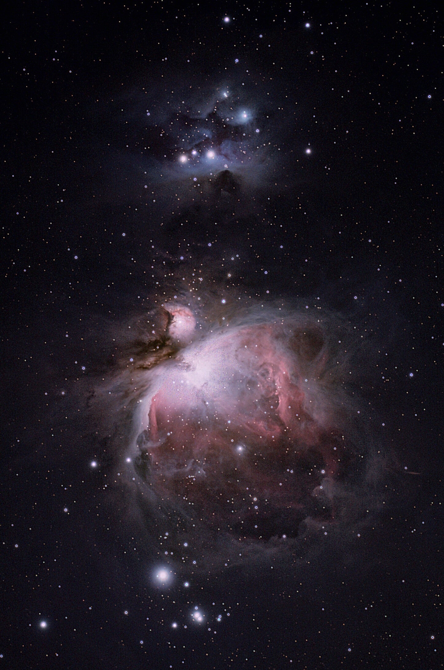 Nébuleuse M42, au dessus M43 en forme de virgule et NGC1977 tout en haut
