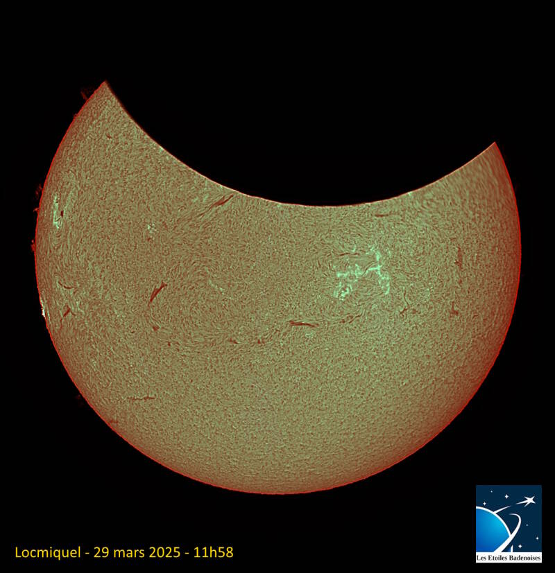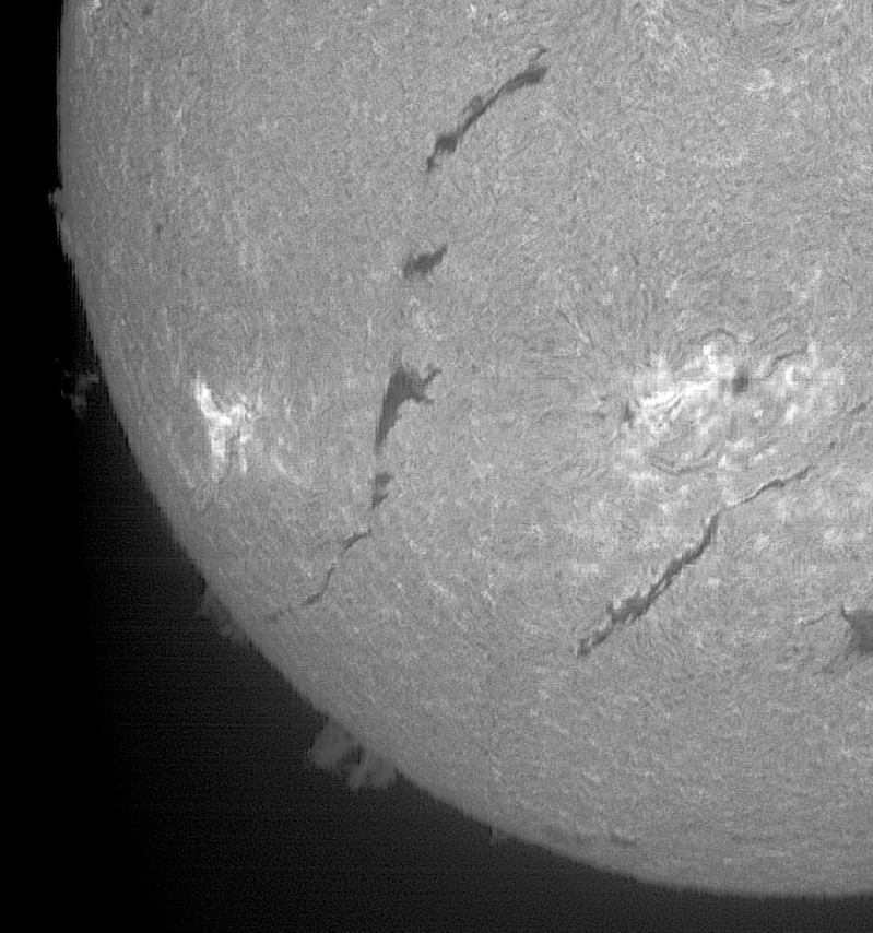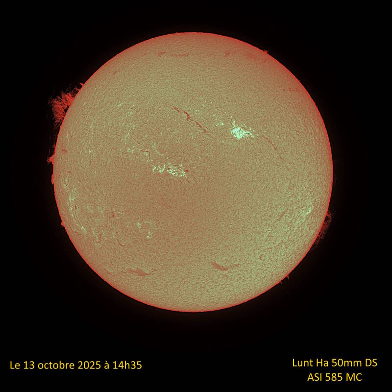 On observe des filaments (sombres), des facules (claires) et des protubérances sur le fond de ciel.