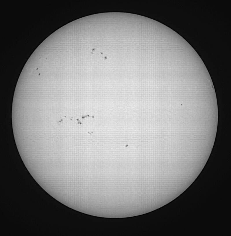 On observe la granulation de la photosphère, l'ombre et la pénombre des taches solaires, ainsi que les plages faculaires plus claires.